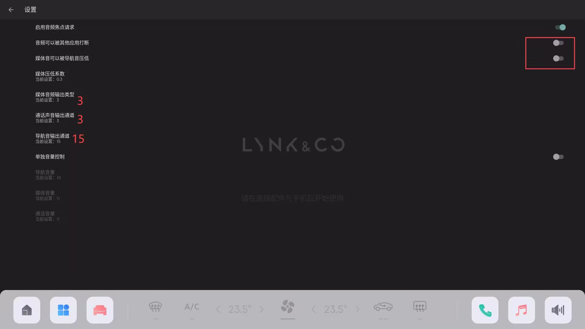 - 点击软件右上角齿轮图标,选择声音设置,关闭 音频可以被其他应用打断、媒体音可以被导航音压低功能;调整声道,媒体音频、通话音频选择声道3,导航音频选择声道15。