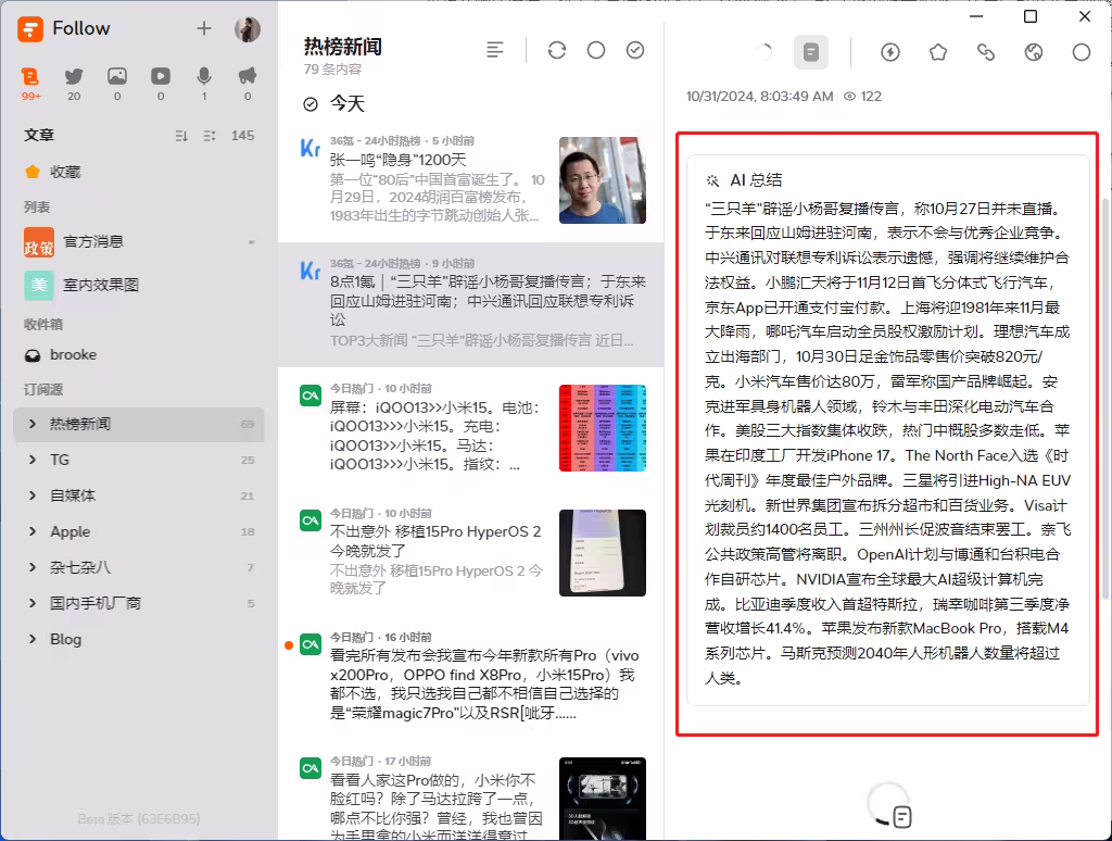 AI 已成为现代产品的标配,Follow 也不例外。它内置了 AI 工具,类似于 iOS 的快捷指令(不过我目前还没完全研究明白),通过设定条件实现自动翻译、生成摘要等功能。比如,Follow 可以自动翻译英文 RSS 源的标题,未来还希望支持沉浸式翻译插件。对于大量推送的文章,Follow 提供 AI 生成的摘要功能,让用户可以先看标题和摘要,再决定是否深入阅读,大大提升阅读效率。同时,它每日为用户生成基于订阅的热点报告,帮助用户快速掌握重要信息。