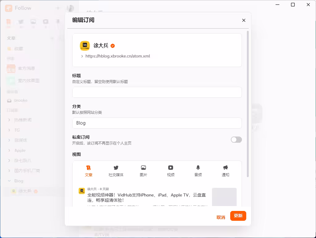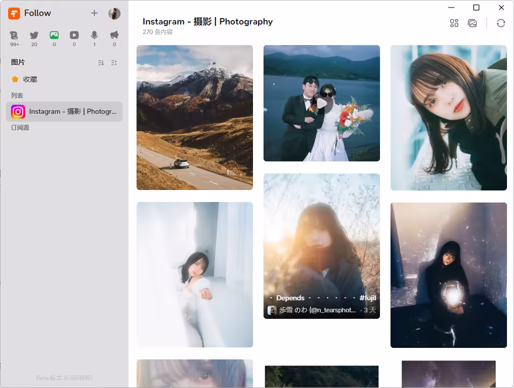 Follow 将内容分为六类:文章、社交媒体、图片、视频、音频和通知。用户可以自由选择查看不同类别的信息,让内容更有条理。得益于 RSSHub 的支持,Follow 还能订阅许多非传统 RSS 支持的内容源,如 B 站、豆瓣、微博等,真正实现“万物皆可 RSS”。