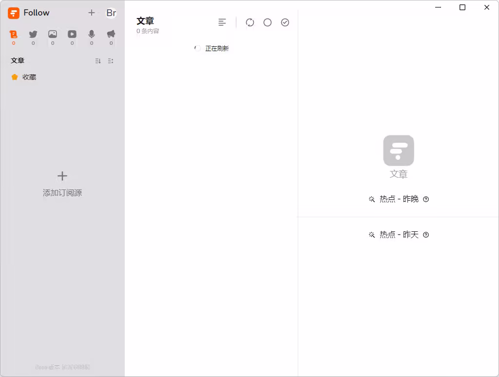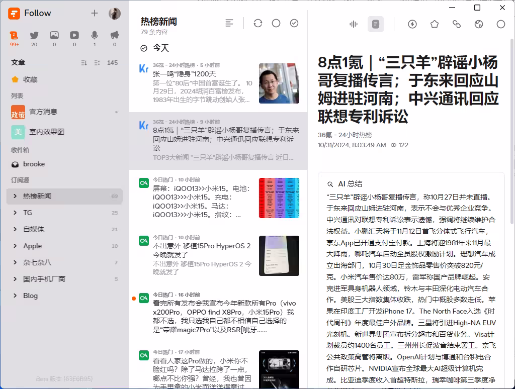 打开 Follow,给人的第一印象是简洁而清新的界面。顶部的按钮清晰划分了不同的信息类别,切换流畅,用户体验非常好(目前个人感觉加载速度慢了)。同时,Follow 提供亮色和暗色模式,用户可以根据环境随意切换。