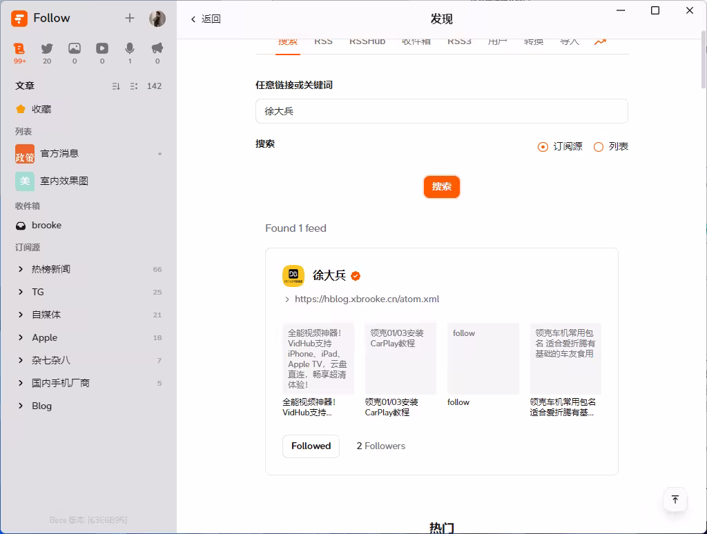 Follow 支持丰富的快捷键操作,非常适合喜欢键盘操作的用户。此外,它集成了 RSSHub 的强大功能,支持直接搜索订阅源或输入 RSSHub 路由,简化了订阅过程。