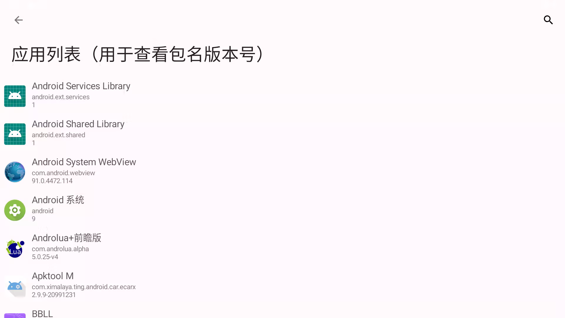 应用列表: 通过【应用列表】功能,您可以查看车机上已安装软件的包名和版本号,以确保软件是最新版本。